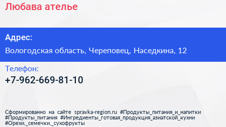 Любава, ателье по адресу Вологодская область, Череповец, Наседкина, 12 в дальнейшем Организация, размещена в следующих категориях:
