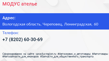 МОДУС, ателье по адресу Вологодская область, Череповец, Ленинградская, 60 в дальнейшем Организация, размещена в следующих категориях: