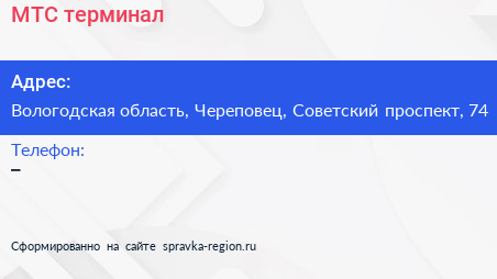МТС, терминал по адресу Вологодская область, Череповец, Советский проспект, 74 в дальнейшем Организация, размещена в следующих категориях:
