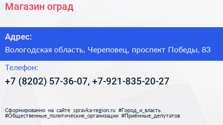Магазин оград по адресу Вологодская область, Череповец, проспект Победы, 83 в дальнейшем Организация, размещена в следующих категориях: