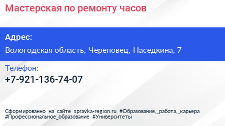 Мастерская по ремонту часов по адресу Вологодская область, Череповец, Наседкина, 7 в дальнейшем Организация, размещена в следующих категориях: