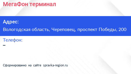 МегаФон, терминал по адресу Вологодская область, Череповец, проспект Победы, 200 в дальнейшем Организация, размещена в следующих категориях: