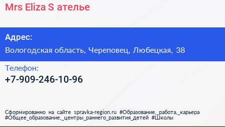 Mrs. Eliza`S, ателье по адресу Вологодская область, Череповец, Любецкая, 38 в дальнейшем Организация, размещена в следующих категориях: