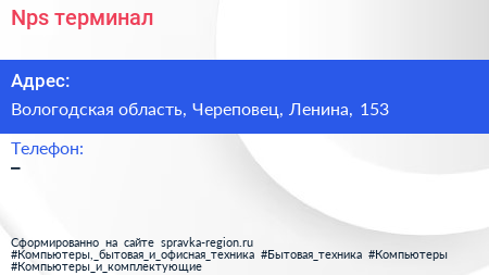 Nps, терминал по адресу Вологодская область, Череповец, Ленина, 153 в дальнейшем Организация, размещена в следующих категориях: