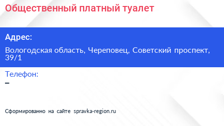 Общественный платный туалет по адресу Вологодская область, Череповец, Советский проспект, 39/1 в дальнейшем Организация, размещена в следующих категориях: