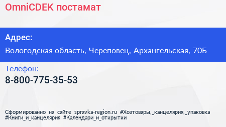 OmniCDEK, постамат по адресу Вологодская область, Череповец, Архангельская, 70Б в дальнейшем Организация, размещена в следующих категориях: