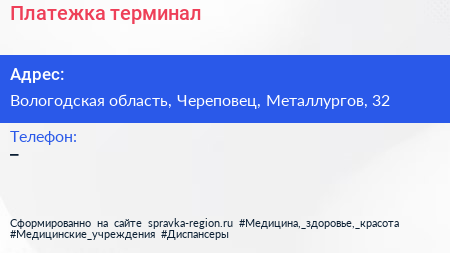 Платежка, терминал по адресу Вологодская область, Череповец, Металлургов, 32 в дальнейшем Организация, размещена в следующих категориях: