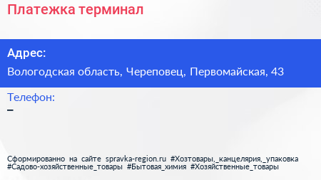 Платежка, терминал по адресу Вологодская область, Череповец, Первомайская, 43 в дальнейшем Организация, размещена в следующих категориях: