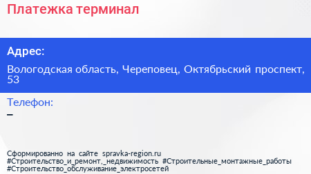 Платежка, терминал по адресу Вологодская область, Череповец, Октябрьский проспект, 53 в дальнейшем Организация, размещена в следующих категориях: