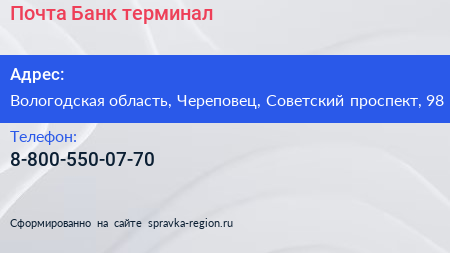 Почта Банк, терминал по адресу Вологодская область, Череповец, Советский проспект, 98 в дальнейшем Организация, размещена в следующих категориях: