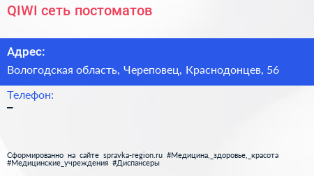 QIWI, сеть поcтоматов по адресу Вологодская область, Череповец, Краснодонцев, 56 в дальнейшем Организация, размещена в следующих категориях: