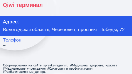 Qiwi, терминал по адресу Вологодская область, Череповец, проспект Победы, 72 в дальнейшем Организация, размещена в следующих категориях: