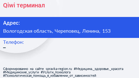 Qiwi, терминал по адресу Вологодская область, Череповец, Ленина, 153 в дальнейшем Организация, размещена в следующих категориях: