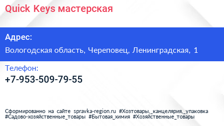 Quick Keys, мастерская по адресу Вологодская область, Череповец, Ленинградская, 1 в дальнейшем Организация, размещена в следующих категориях: