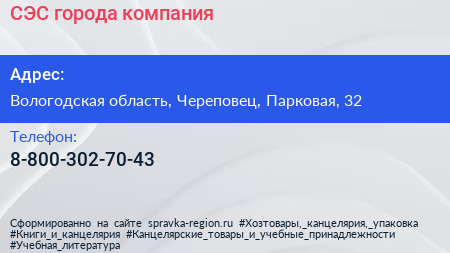 СЭС города, компания по адресу Вологодская область, Череповец, Парковая, 32 в дальнейшем Организация, размещена в следующих категориях: