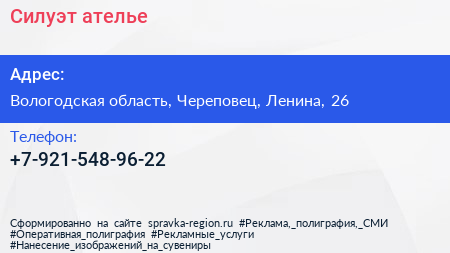 Силуэт, ателье по адресу Вологодская область, Череповец, Ленина, 26 в дальнейшем Организация, размещена в следующих категориях: