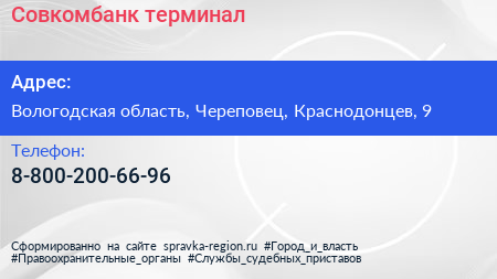 Совкомбанк, терминал по адресу Вологодская область, Череповец, Краснодонцев, 9 в дальнейшем Организация, размещена в следующих категориях: