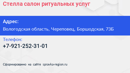 Стелла, салон ритуальных услуг по адресу Вологодская область, Череповец, Боршодская, 73Б в дальнейшем Организация, размещена в следующих категориях: