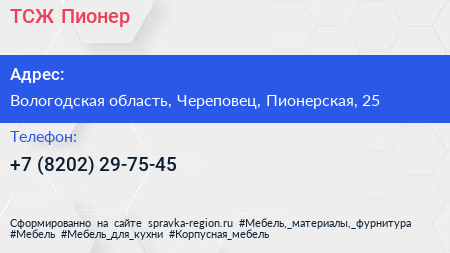ТСЖ Пионер по адресу Вологодская область, Череповец, Пионерская, 25 в дальнейшем Организация, размещена в следующих категориях: