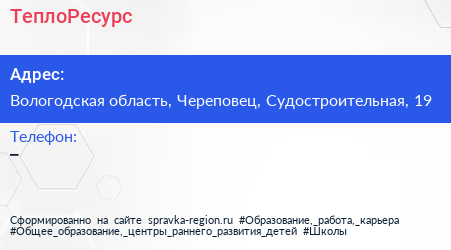 ТеплоРесурс по адресу Вологодская область, Череповец, Судостроительная, 19 в дальнейшем Организация, размещена в следующих категориях: