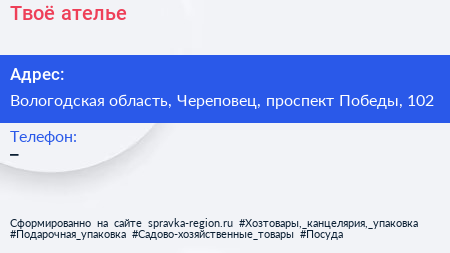 Твоё, ателье по адресу Вологодская область, Череповец, проспект Победы, 102 в дальнейшем Организация, размещена в следующих категориях: