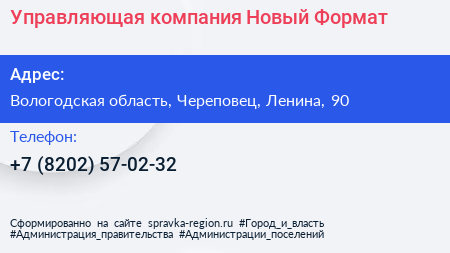 Управляющая компания Новый Формат по адресу Вологодская область, Череповец, Ленина, 90 в дальнейшем Организация, размещена в следующих категориях: