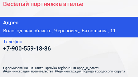 Весёлый портняжка, ателье по адресу Вологодская область, Череповец, Батюшкова, 11 в дальнейшем Организация, размещена в следующих категориях: