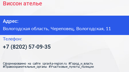 Виссон, ателье по адресу Вологодская область, Череповец, Вологодская, 11 в дальнейшем Организация, размещена в следующих категориях: