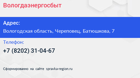 Вологдаэнергосбыт по адресу Вологодская область, Череповец, Батюшкова, 7 в дальнейшем Организация, размещена в следующих категориях: