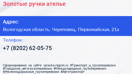 Золотые ручки, ателье по адресу Вологодская область, Череповец, Первомайская, 21а в дальнейшем Организация, размещена в следующих категориях: