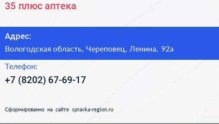 35 плюс, аптека по адресу Вологодская область, Череповец, Ленина, 92а в дальнейшем Организация, размещена в следующих категориях: