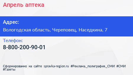 Апрель, аптека по адресу Вологодская область, Череповец, Наседкина, 7 в дальнейшем Организация, размещена в следующих категориях: