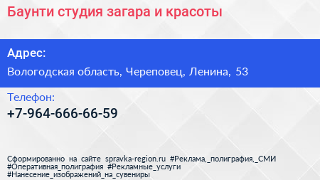 Баунти, студия загара и красоты по адресу Вологодская область, Череповец, Ленина, 53 в дальнейшем Организация, размещена в следующих категориях:
