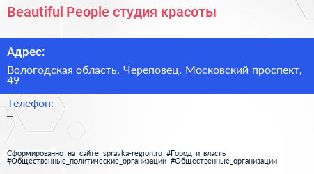 Beautiful People, cтудия красоты по адресу Вологодская область, Череповец, Московский проспект, 49 в дальнейшем Организация, размещена в следующих категориях:
