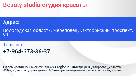Beauty studio, студия красоты по адресу Вологодская область, Череповец, Октябрьский проспект, 91 в дальнейшем Организация, размещена в следующих категориях: