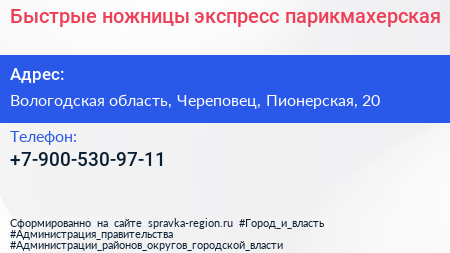 Быстрые ножницы, экспресс-парикмахерская по адресу Вологодская область, Череповец, Пионерская, 20 в дальнейшем Организация, размещена в следующих категориях: