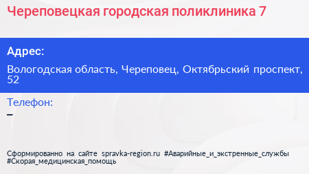 Череповецкая городская поликлиника №7 по адресу Вологодская область, Череповец, Октябрьский проспект, 52 в дальнейшем Организация, размещена в следующих категориях: