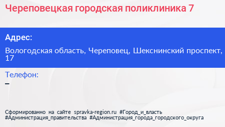 Череповецкая городская поликлиника №7 по адресу Вологодская область, Череповец, Шекснинский проспект, 17 в дальнейшем Организация, размещена в следующих категориях: