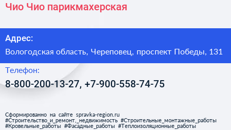 Чио Чио, парикмахерская по адресу Вологодская область, Череповец, проспект Победы, 131 в дальнейшем Организация, размещена в следующих категориях: