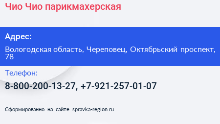 Чио Чио, парикмахерская по адресу Вологодская область, Череповец, Октябрьский проспект, 78 в дальнейшем Организация, размещена в следующих категориях:
