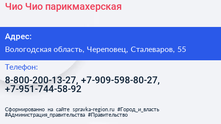 Чио Чио, парикмахерская по адресу Вологодская область, Череповец, Сталеваров, 55 в дальнейшем Организация, размещена в следующих категориях: