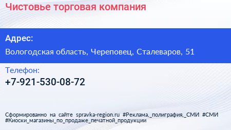 Чистовье, торговая компания по адресу Вологодская область, Череповец, Сталеваров, 51 в дальнейшем Организация, размещена в следующих категориях: