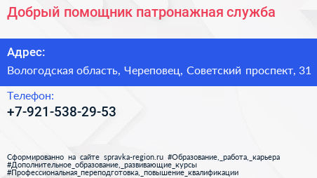 Добрый помощник, патронажная служба по адресу Вологодская область, Череповец, Советский проспект, 31 в дальнейшем Организация, размещена в следующих категориях:
