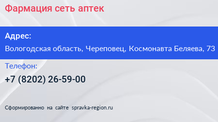 Фармация, сеть аптек по адресу Вологодская область, Череповец, Космонавта Беляева, 73 в дальнейшем Организация, размещена в следующих категориях: