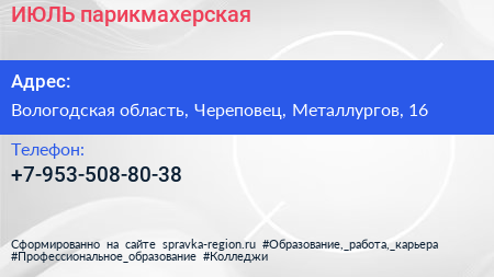 ИЮЛЬ, парикмахерская по адресу Вологодская область, Череповец, Металлургов, 16 в дальнейшем Организация, размещена в следующих категориях: