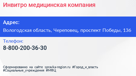 Инвитро, медицинская компания по адресу Вологодская область, Череповец, проспект Победы, 136 в дальнейшем Организация, размещена в следующих категориях: