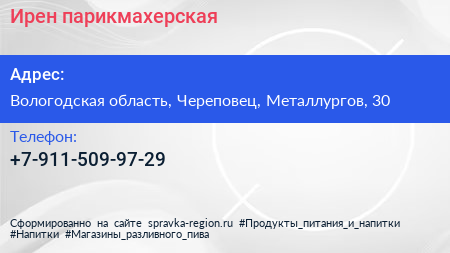 Ирен, парикмахерская по адресу Вологодская область, Череповец, Металлургов, 30 в дальнейшем Организация, размещена в следующих категориях: