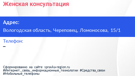 Женская консультация по адресу Вологодская область, Череповец, Ломоносова, 15/1 в дальнейшем Организация, размещена в следующих категориях: