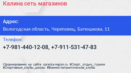 Калина, сеть магазинов по адресу Вологодская область, Череповец, Батюшкова, 11 в дальнейшем Организация, размещена в следующих категориях: