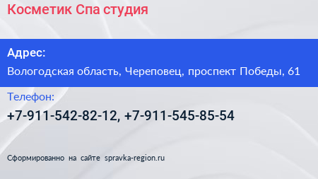 Косметик Спа, студия по адресу Вологодская область, Череповец, проспект Победы, 61 в дальнейшем Организация, размещена в следующих категориях: